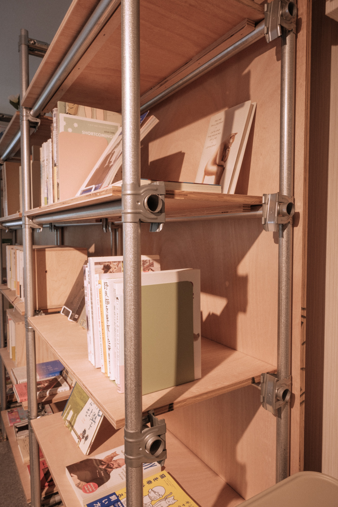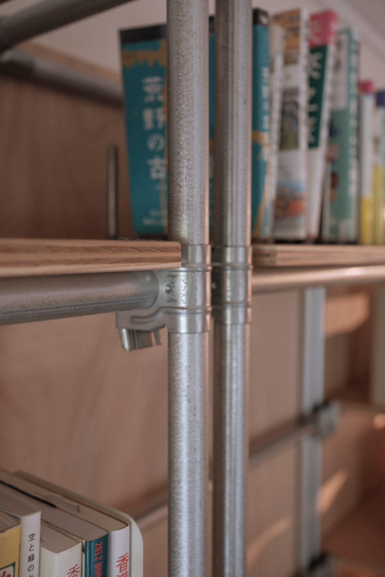 そこで骨組みはパイプ鋼材とし、棚板や背板にラワン合板を採用することで、ラフ過ぎず、冷た過ぎないデザインのバランス感覚を保ちながわ骨組みのジョイントには”くさび”で緊結する資材を採用することでシンプルでありながら力強いデザインの家具ができました。