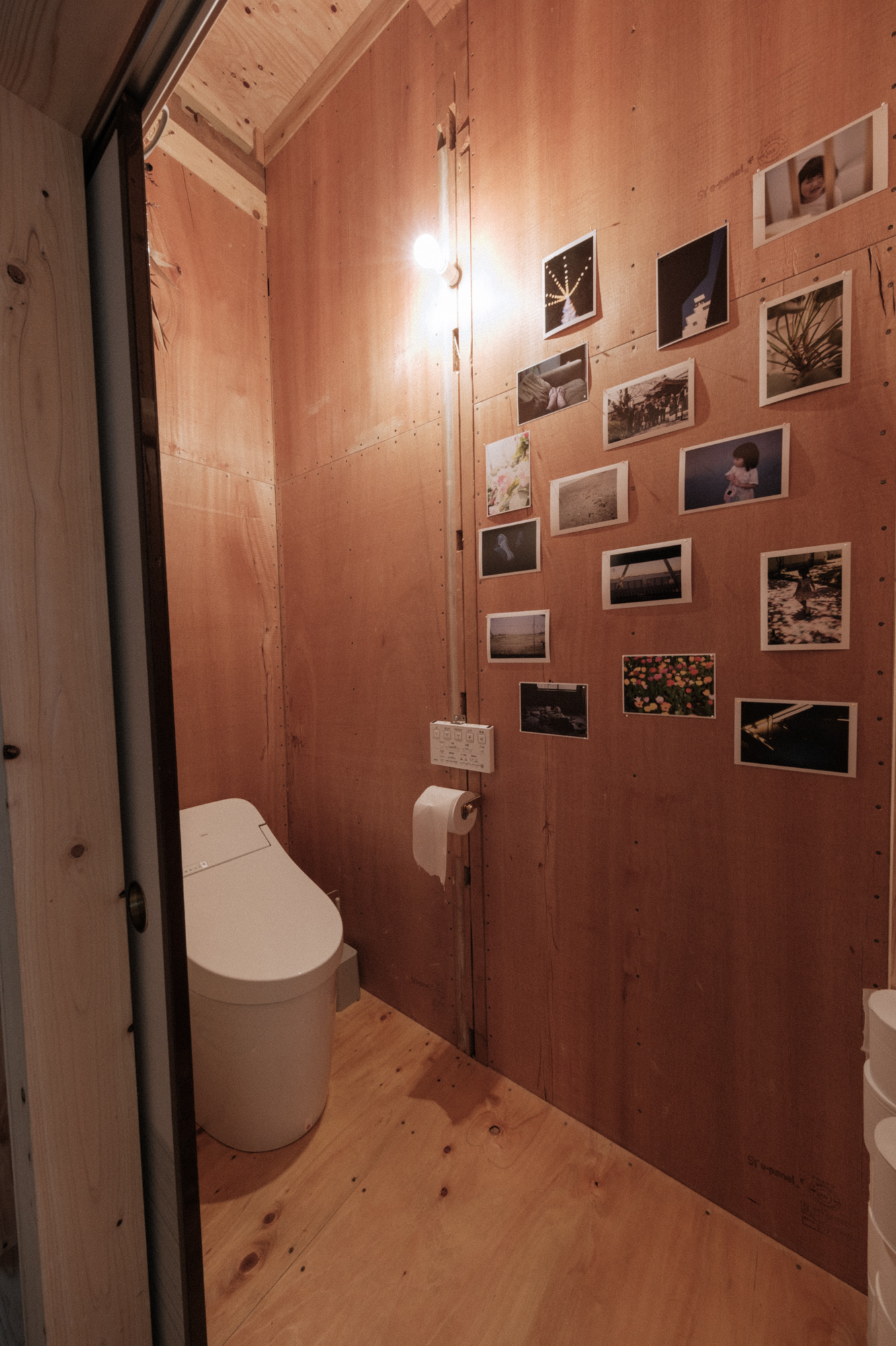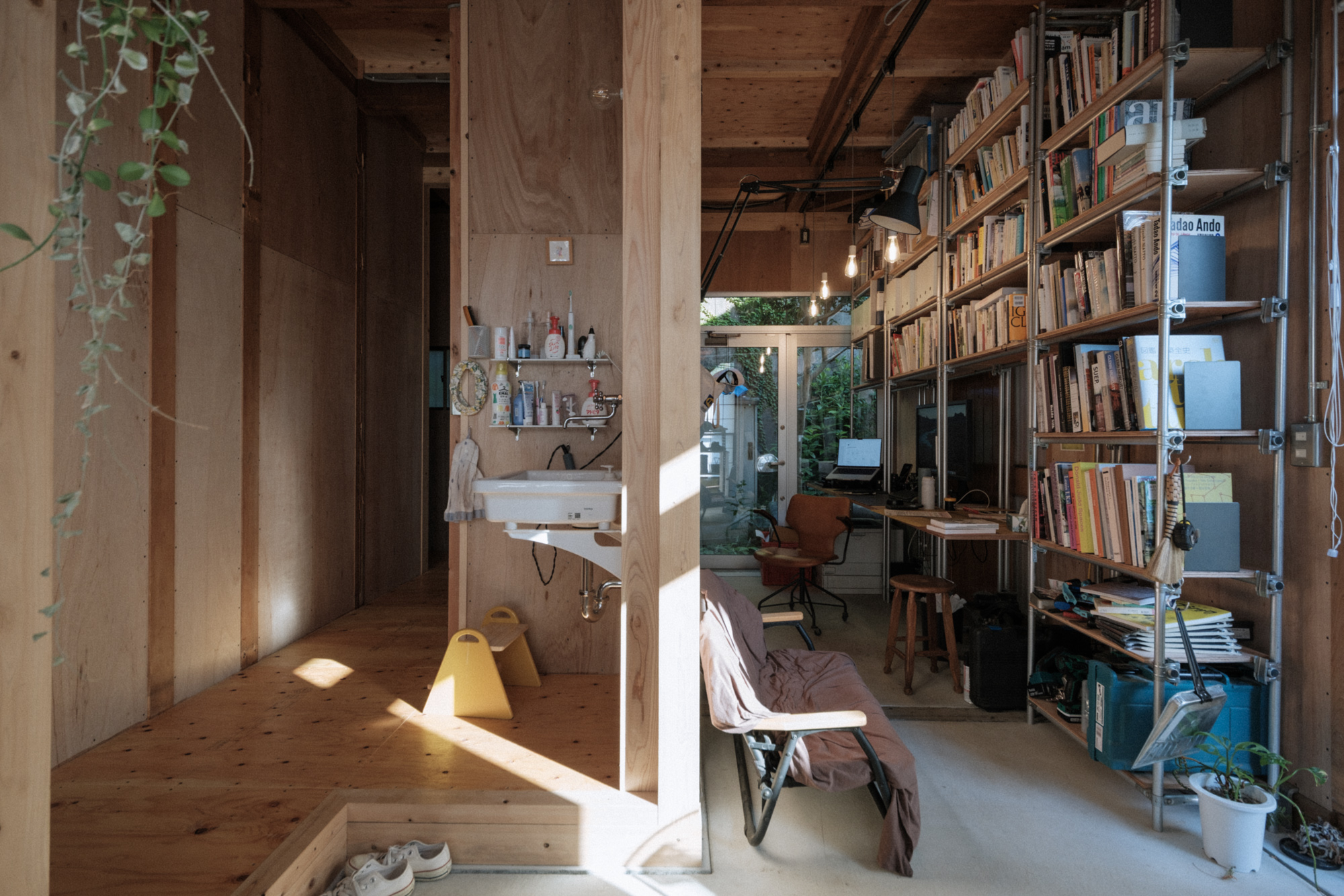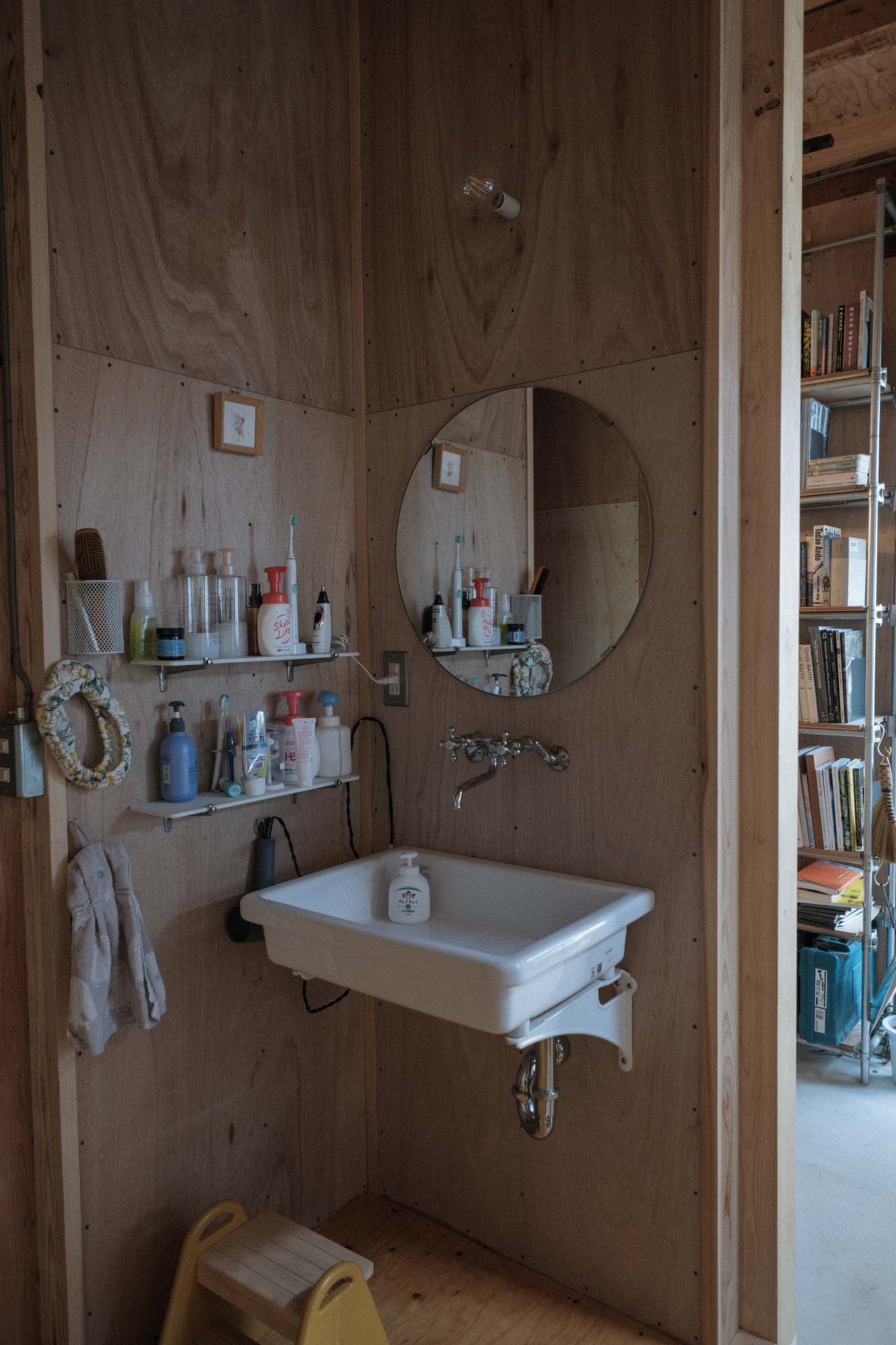 この家の壁は耐力壁を形成するためにラワン構造用合板を使用し、取り付ける釘も含めてそのまま表している。また天井の梁や屋根の断熱材、浴室も防水下地であるFRP防水のみの状態で使っている。