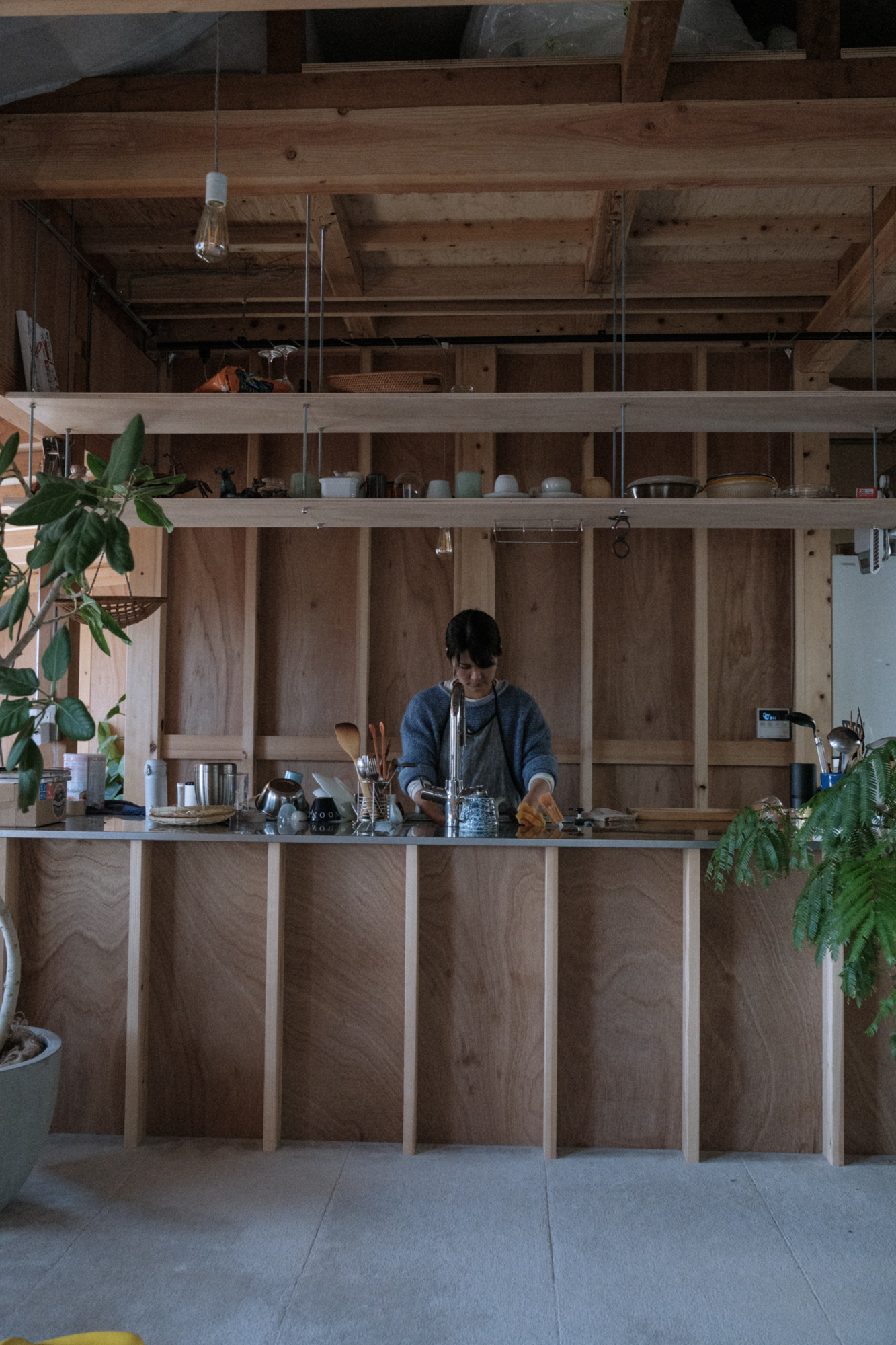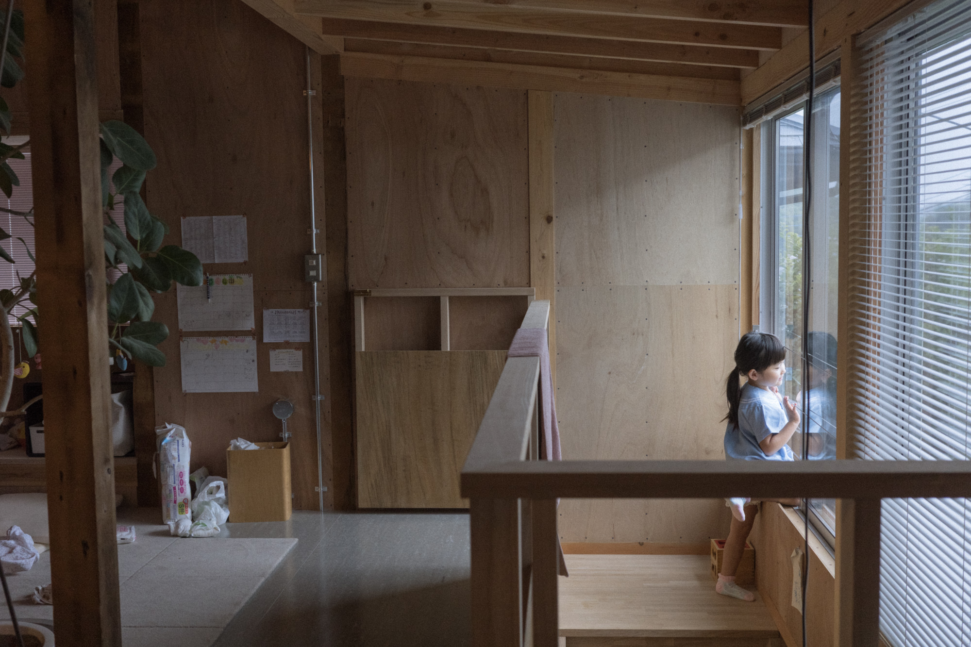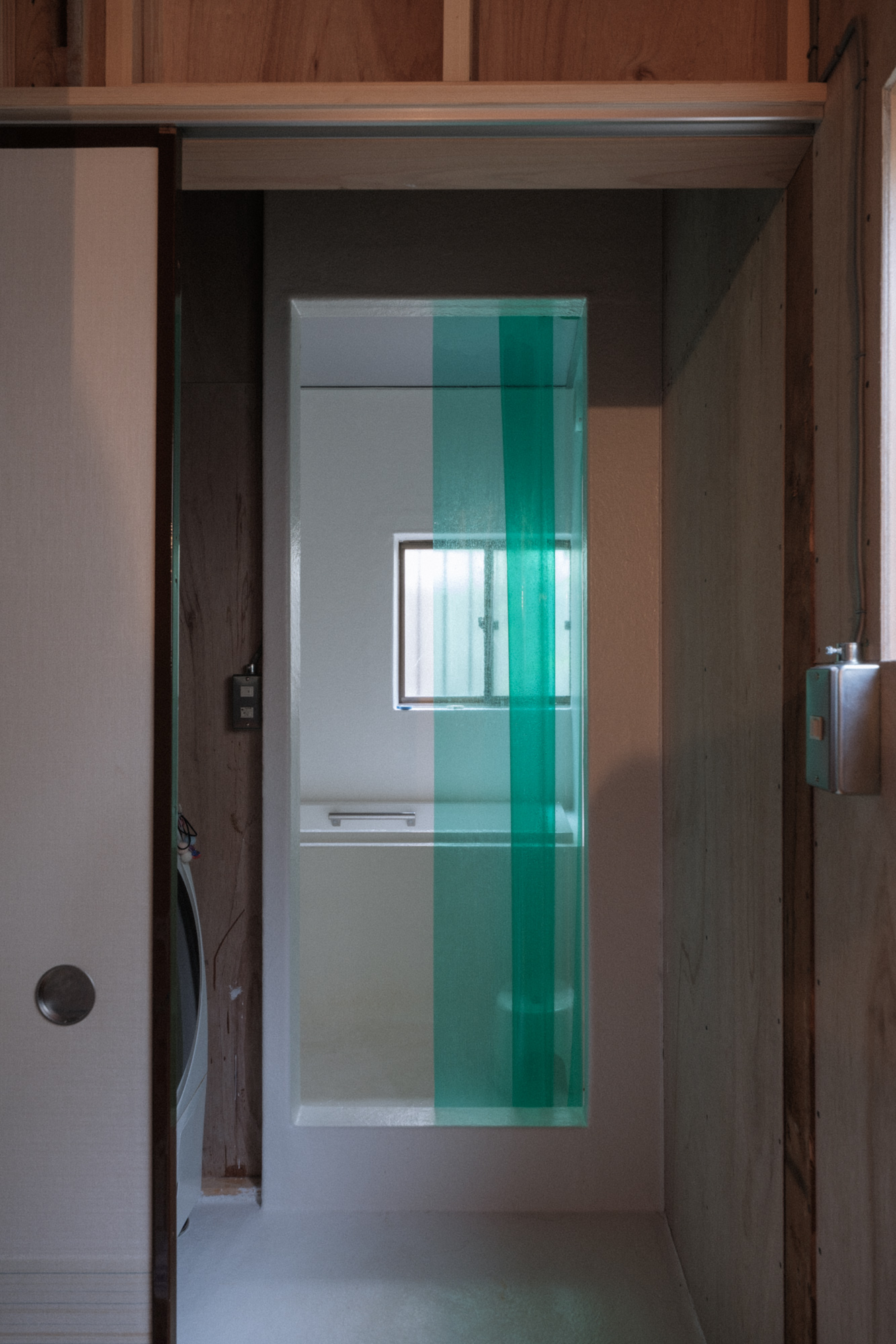 この家の壁は耐力壁を形成するためにラワン構造用合板を使用し、取り付ける釘も含めてそのまま表している。また天井の梁や屋根の断熱材、浴室も防水下地であるFRP防水のみの状態で使っている。