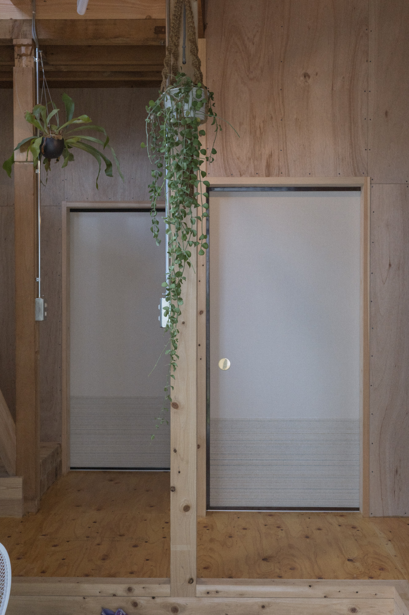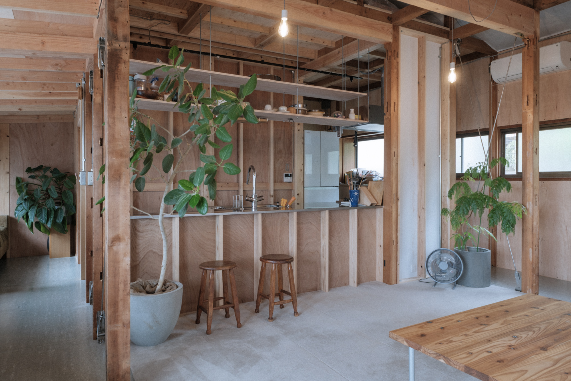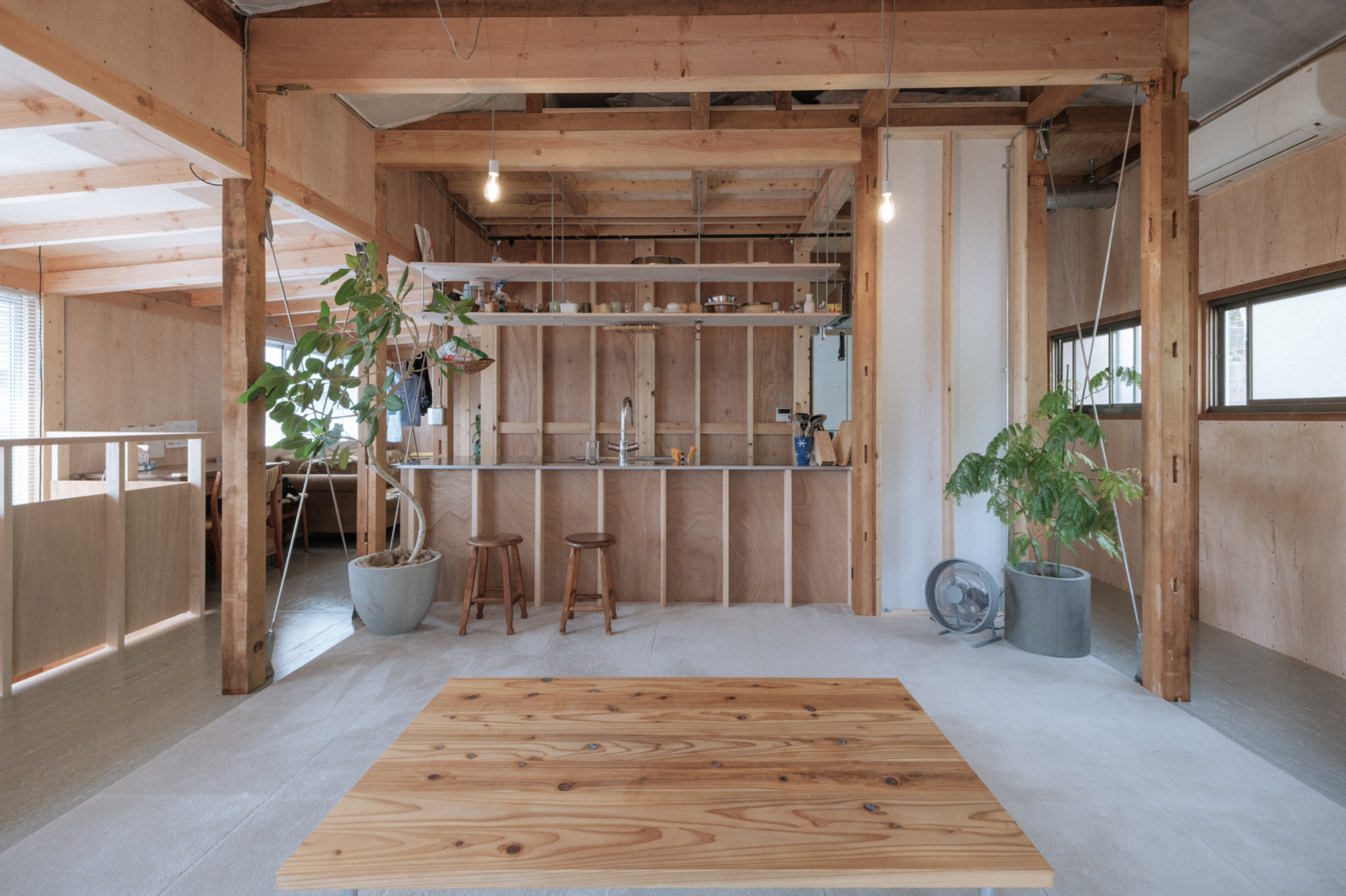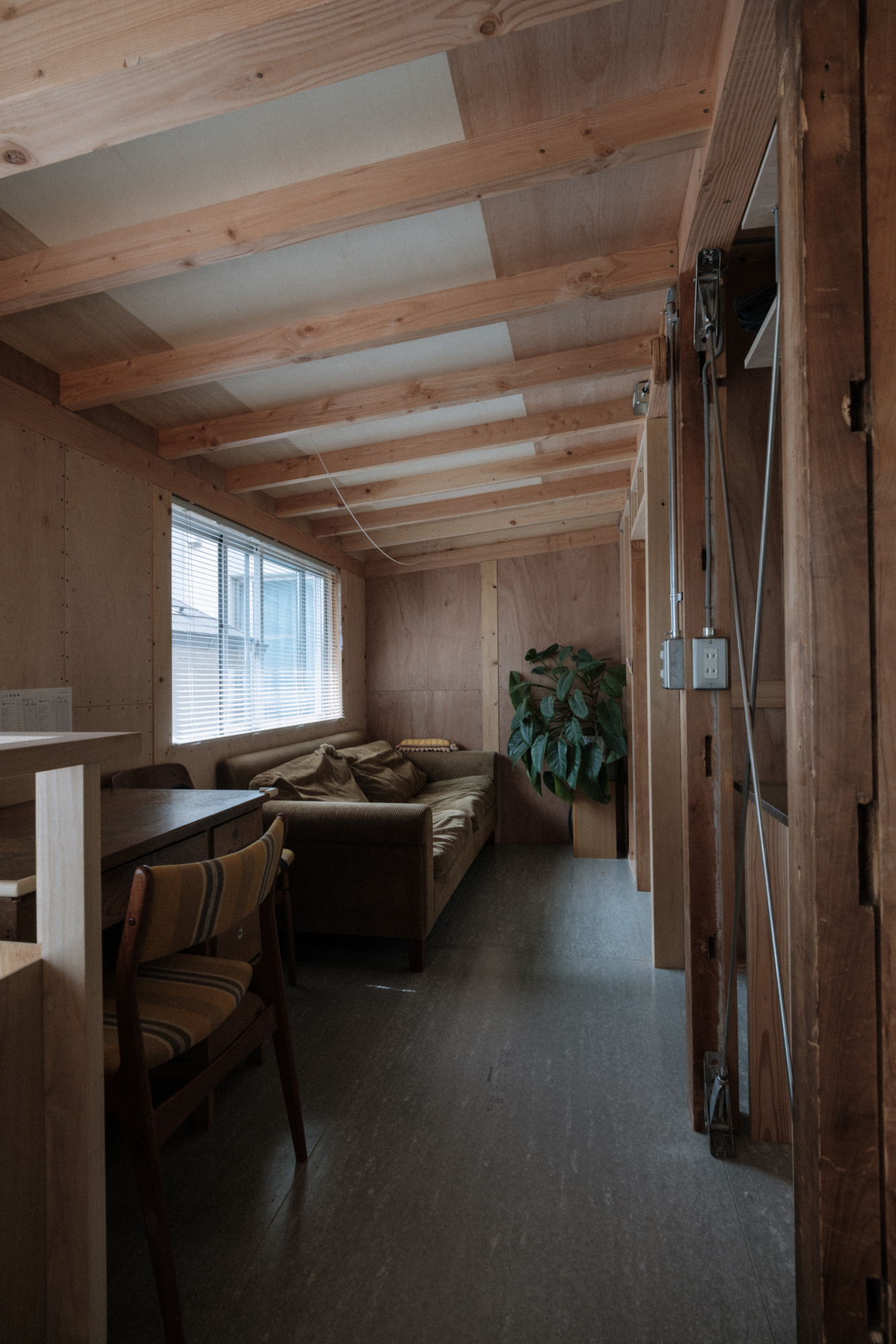 「素地の美」:構造用合板や外壁モルタルなどの一般に下地材と言われる材料はその場に求められた性能を発揮することに存在価値があり、その飾らなさ故の美がある。