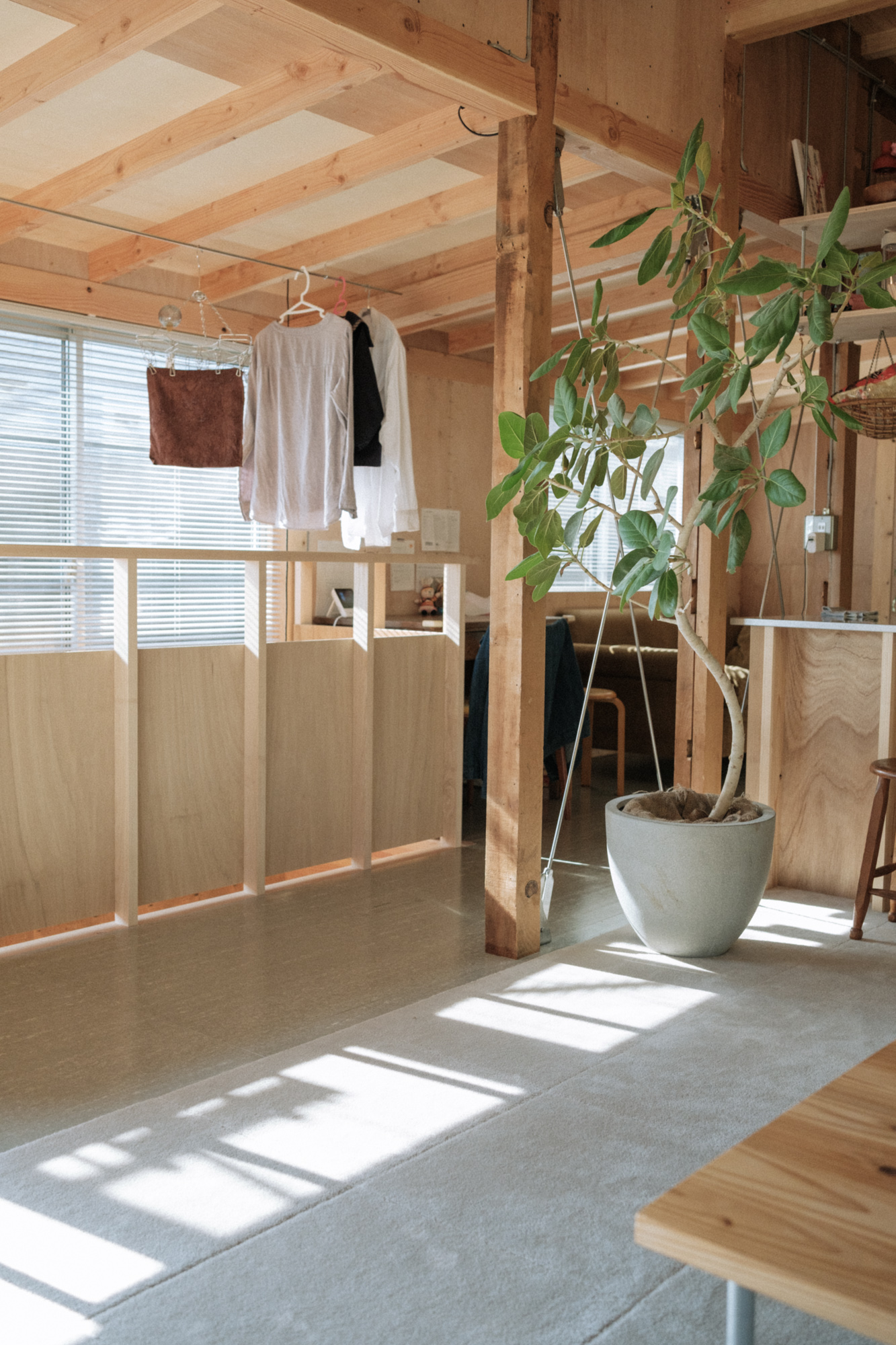 この家では骨格である柱・梁・下地を可能な限り見えるように計画し、荷重の流れを身体感覚として感じることで骨格の美を体感することができる。